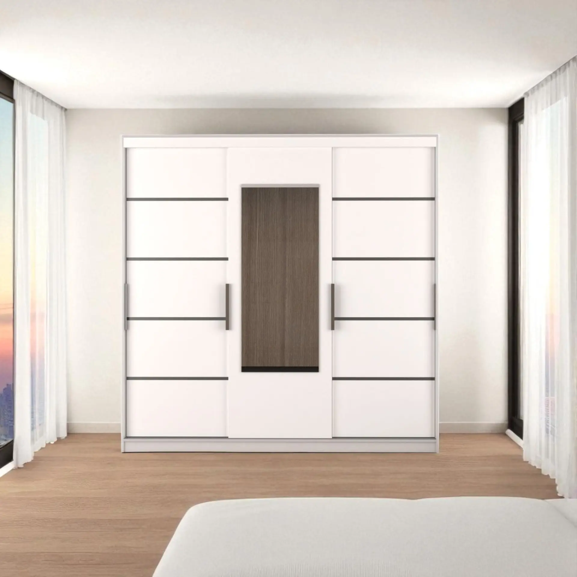 Modern evlerin vazgeçilmez mobilyası olarak tasarlanan bu parlak beyaz sürgülü gardırop, geniş iç hacmi ve zarif görünümüyle