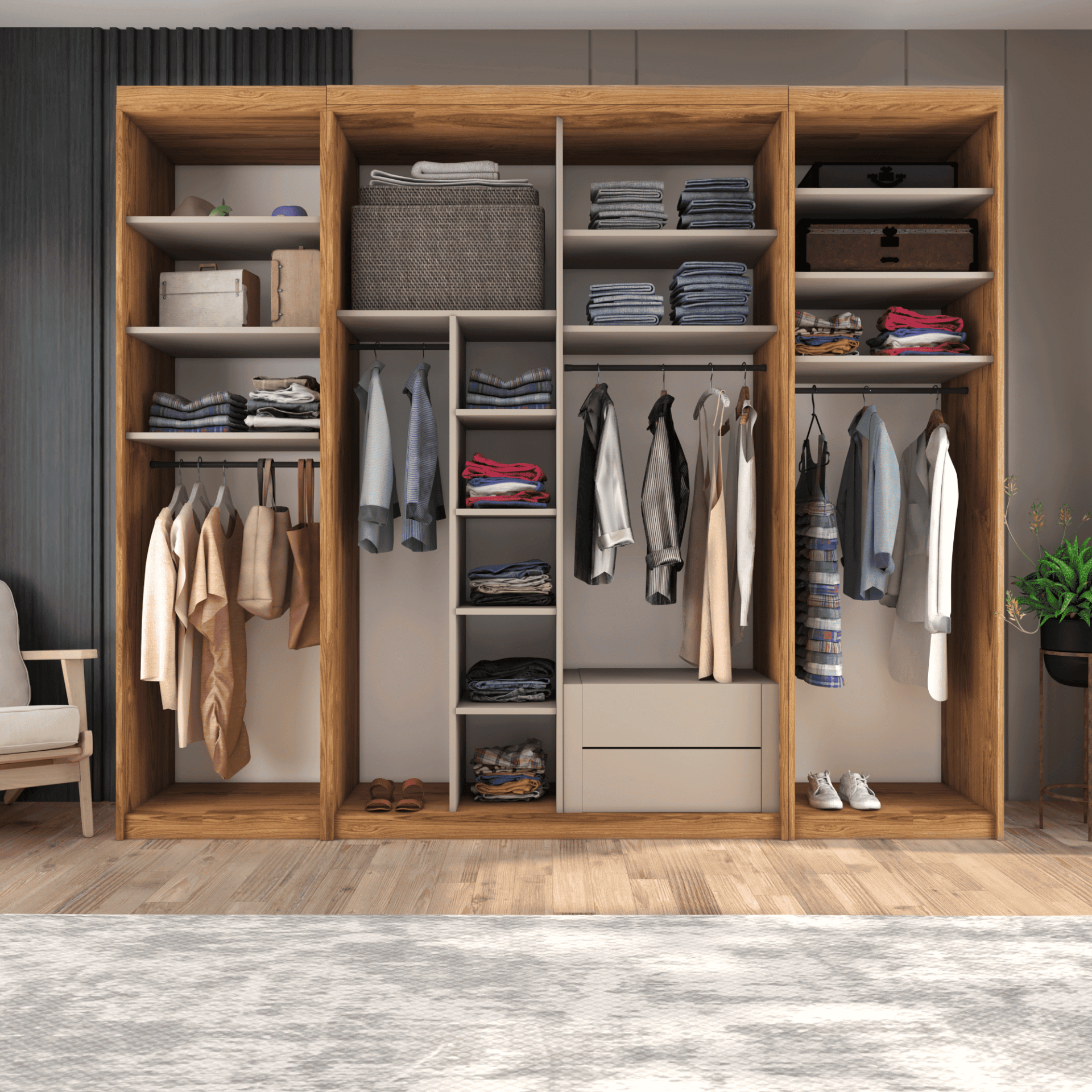 ✔ Geniş Depolama Alanı: Günlük ve mevsimlik kıyafetler için düzenli ve ferah iç hacim.