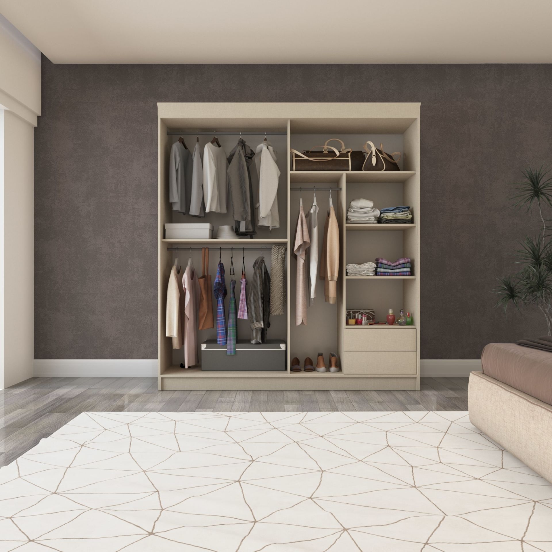İki kapaklı ve aynalı tasarımıyla odanıza ferahlık ve şıklık katarken, 140x210 cm boyutlarıyla kullanışlı bir depolama alanı sağlar.