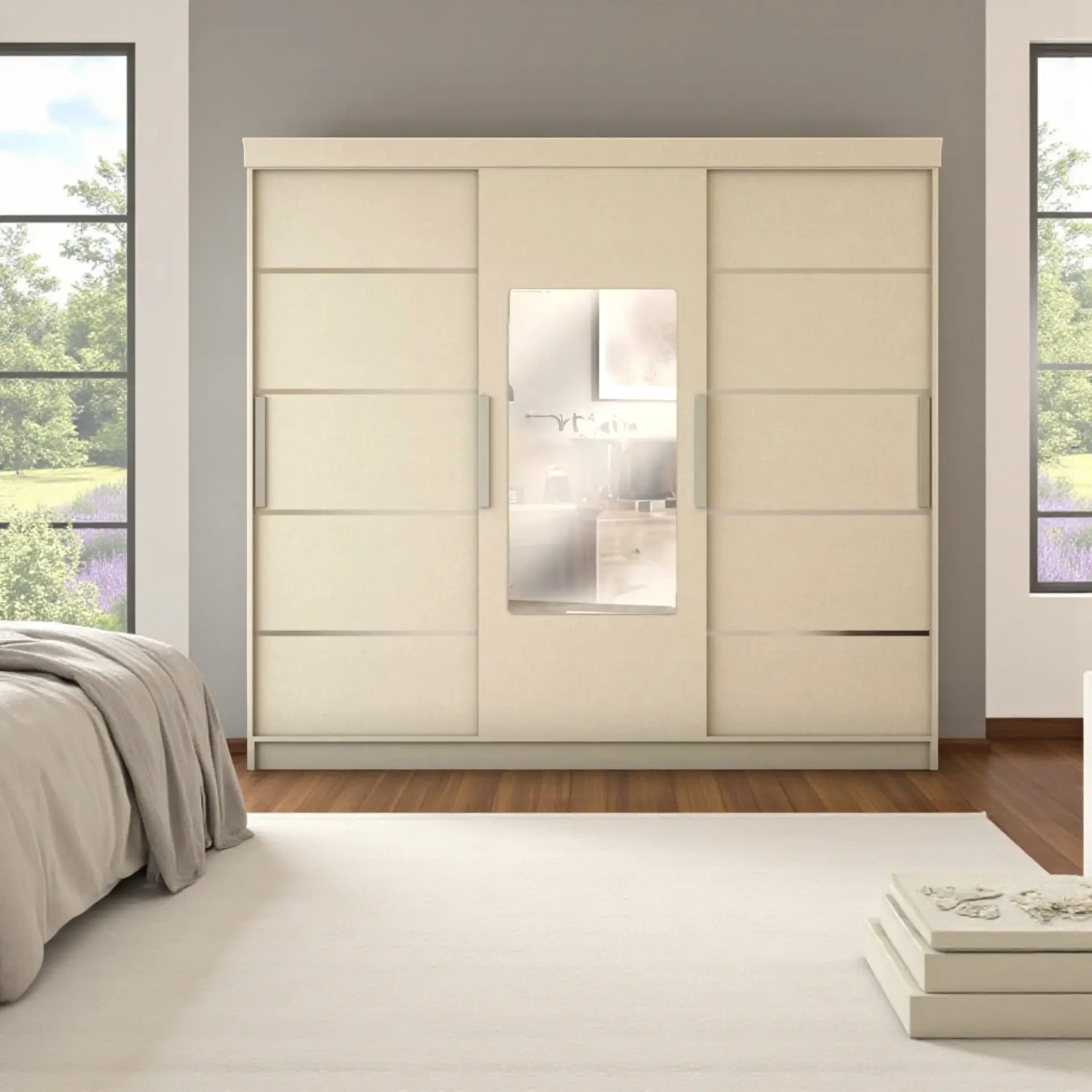 Bu gardırop modeli, modern çizgileriyle çağdaş ev dekorasyonlarına mükemmel uyum sağlar. Koton vizon rengi, hem nötr hem sıcak bir bej-vizon tonuyla yatak odalarına zarif bir atmosfer katar. Aynalı orta panel, odanızı daha geniş ve aydınlık gösterirken aynı zamanda günlük kullanımda pratik bir fonksiyon sunar.