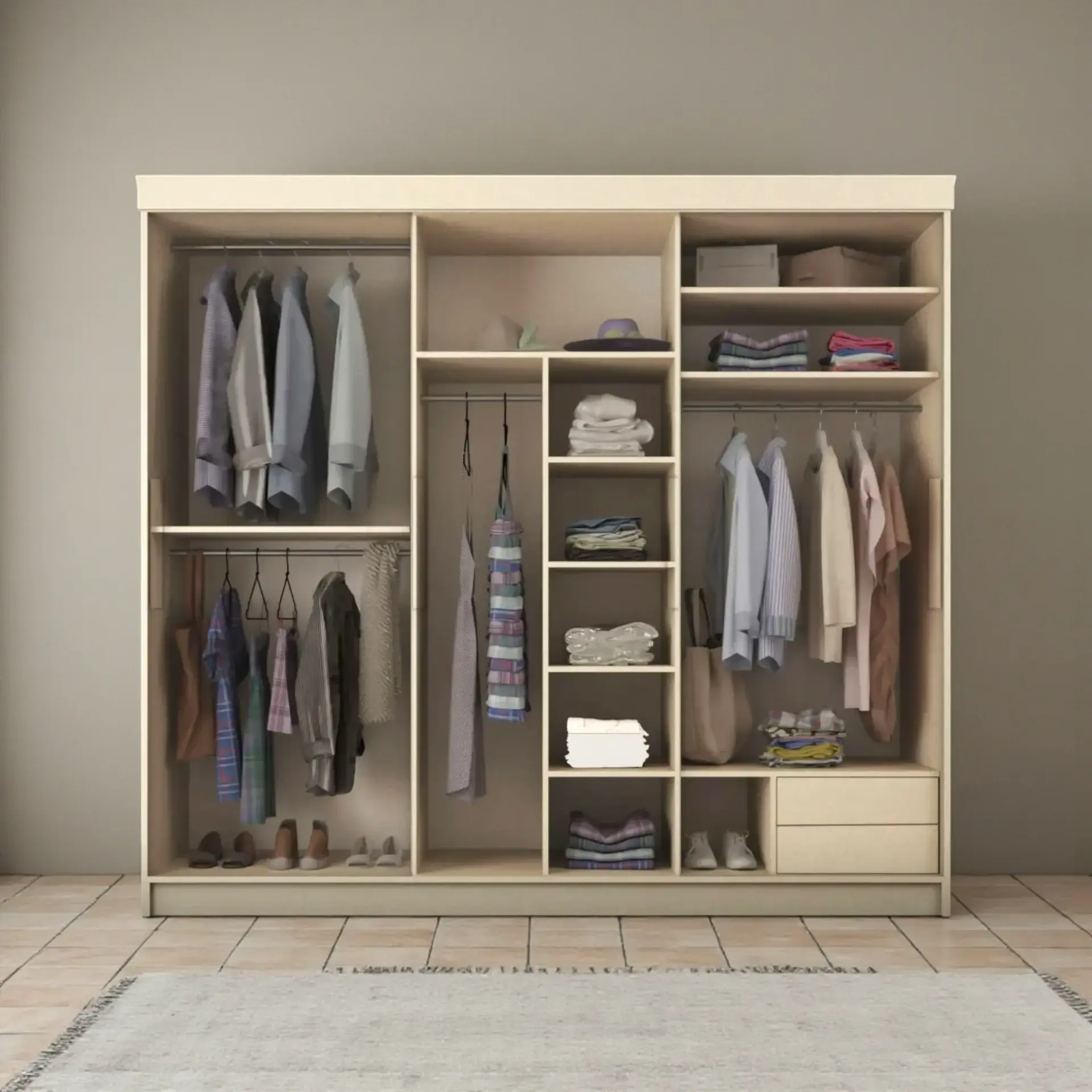 Fonksiyonel İç Düzen: Askı boruları, raf alanları ve çekmeceler ile düzenli saklama imkânı